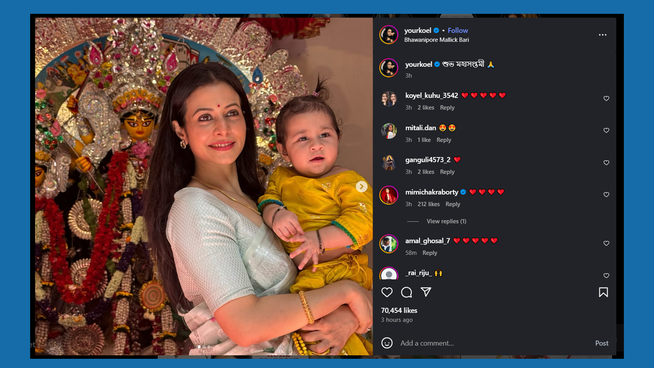 প্রকাশিত প্রথম ছবিতে কোয়েলকে তার ঐতিহ্যবাহী মল্লিক বাড়ির দুর্গামায়ের সামনে মেয়েকে কোলে নিয়ে দাঁড়িয়ে থাকতে দেখা যায়। ছোট্ট কাব্যার পরনে ছিল হলুদ ঘাগরা, যার সবুজ বর্ডারের ছোঁয়ায় উৎসবের রঙ আরও উজ্জ্বল হয়েছে।
