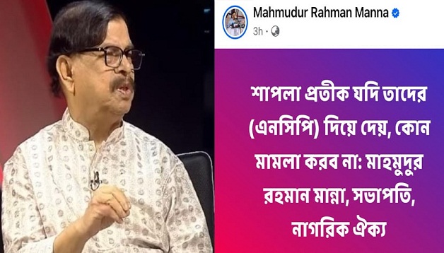 ফেসবুক পোস্টে তিনি লেখেন, ‘শাপলা প্রতীক যদি তাদের (এনসিপি) দিয়ে দেয়, কোনো মামলা করব না : মাহমুদুর রহমান মান্না, সভাপতি, নাগরিক ঐক্য’।