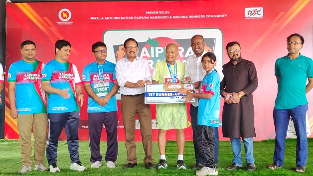 নরসিংদী প্রতিনিধি : ‘রান ফর বাংলাদেশ, রান ফর হেলথ’ স্লোগানে নরসিংদীর রায়পুরায় দেশ বিদেশের ৭০০ দৌড়বিদের অংশগ্রহণে অনুষ্ঠিত হলো রায়পুরা ম্যারাথন। শুক্রবার (৩ অক্টোবর) ভোর পাঁচটা থেকে শুরু হওয়া এ ম্যারাথন প্রতিযোগিতায় অংশ নিয়ে ১০ কিলোমিটার দৌড়ে ফার্স্ট রানারআপ হয়েছে পলাশের রুবাইয়া ইসলাম (১০) রোদিয়া।