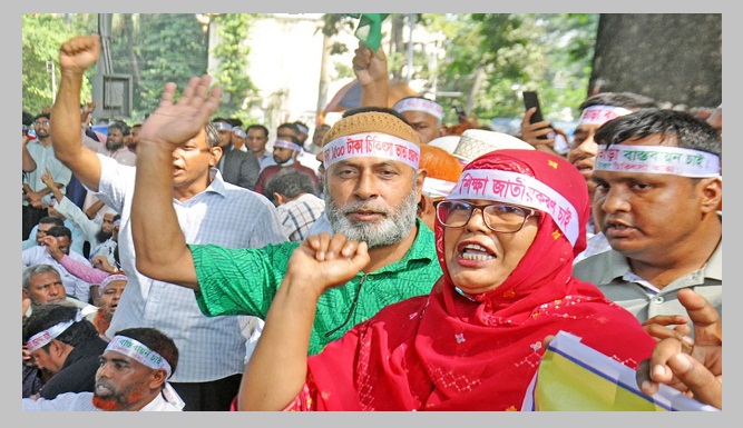 ২০ শতাংশ বাড়ি ভাড়া, ১৫০০ টাকা মেডিকেল ভাতা এবং কর্মচারীদের জন্য ৭৫ শতাংশ উৎসব ভাতার প্রজ্ঞাপণের দাবিতে গত কয়েকদিন ধরে কেন্দ্রীয় শহীদ মিনারে অবস্থান করছেন শিক্ষকরা।