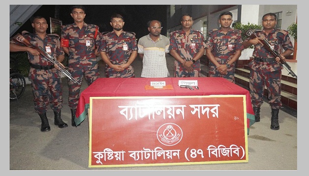 বিজিবি সূত্রে জানা গেছে, শুক্রবার রাতে বিশেষ অভিযানে কুষ্টিয়া ৪৭ বিজিবি ব্যাটালিয়নের একটি টহল দল তাকে আটক করে। এ সময় তার কাছ থেকে একটি বিদেশি পিস্তল, একটি ম্যাগাজিন, এক রাউন্ড গুলি ও ৪৮ গ্রাম হেরোইন উদ্ধার করা হয়। উদ্ধারকৃত অস্ত্র ও মাদকের আনুমানিক বাজারমূল্য প্রায় ২ লাখ ৬ হাজার টাকা।