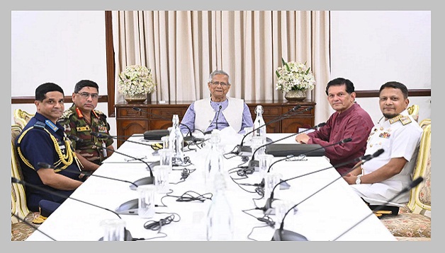 অনলাইন ডেস্ক : প্রধান উপদেষ্টা ড. মুহাম্মদ ইউনূসের সঙ্গে ‘গুরুত্বপূর্ণ বৈঠক’ করেছেন সেনাবাহিনী, বিমানবাহিনী ও নৌ বাহিনীর প্রধান।