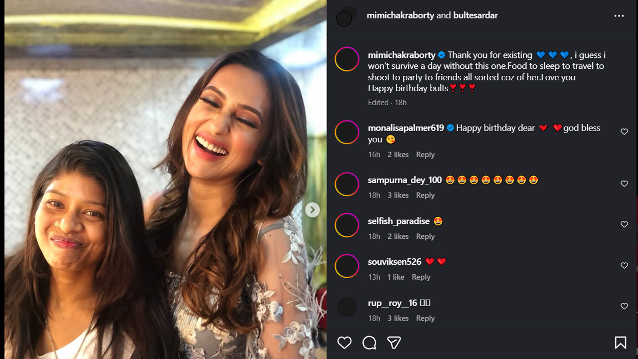 বুল্টির সঙ্গে একগুচ্ছ ছবি পোস্ট করে মিমি লেখেন, ‘ভাগ্যিস তুই ছিলিস, আমার মনে হয়, তোকে ছাড়া আমি একটা দিনও থাকতে পারব না। খাবার থেকে ঘুম, ট্রাভেল থেকে শুট, পার্টি থেকে বন্ধু আমার জীবনে সবটা গোছানো শুধু তোর জন্য। লাভ ইউ, শুভ জন্মদিন বুল্টি।’