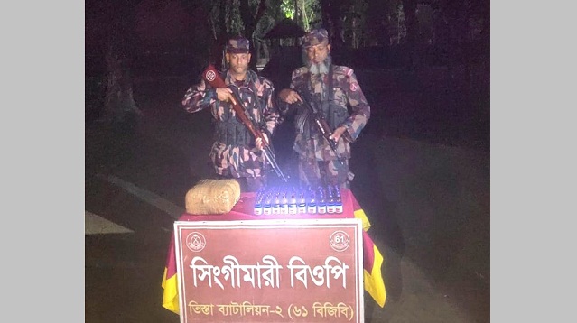 আসাদ হোসেন রিফাতঃ  লালমনিরহাট জেলার হাতীবান্ধা সীমান্তে তিস্তা ব্যাটালিয়ন এর অধিনস্থ সিংগীমারী বিওপির টহলদল কর্তৃক ১১ নভেম্বর ২০২৫ তারিখ রাতে মাদক বিরোধী অভিযান পরিচালনা করে উত্তর সিংগীমারী নামক স্থান হতে মাদকদ্রব্য ভারতীয় গাঁজা-০৫ কেজি এবং এস্কাপ সিরাপ-৫০ বোতল আটক করা হয়।
