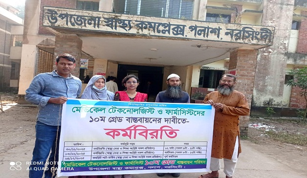 কর্মবিরতি করে মেডিকেল টেকনোলজিস্ট ও ফার্মাসিস্টরা সমবেত হন পলাশ উপজেলা স্বাস্থ্য কমপ্লেক্সের বহির্বিভাগে। আন্দোলনে নেতারা জানান, সমযোগ্যতা সম্পন্ন সকল ডিপ্লোমাধারীরা বর্তমানে ১০ গ্রেডে বেতন ভাতাাদিসহ অন্যান্য সুযোগ সুবিধা ভোগ করলেও, শুধু মেডিকেল টেকনোলজিস্ট ও ফার্মাসিস্টদরা এখনও ১১তম গ্রেডে বহাল রয়েছে, মেডিকেল টেকনোলজিস্ট ও ফার্মাসিস্টদের ১০ম গ্রেড বাস্তবায়নের ফাইলটি জনপ্রশসনে মন্ত্রণালয়ে প্রক্রিয়াধীন রয়েছে। নিয়মতান্ত্রিক উপায়ে আন্দোলন, সংগ্রাম, দাফতরিক চিঠি চালাচালি, জনপ্রশাসন বিধি শাখার সমস্ত চাহিদা পূরণ করা সত্ত্বেও সময়ক্ষেপণ ও জটিলতা তৈরি হচ্ছে। দাবি মেনে নেয়া না হলে ৪ তারিখ থেকে কমপ্লিট শাট-ডাউন পালন করা হবে।