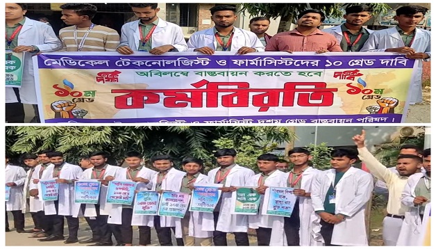 বাস্তবায়নের দাবিতে কর্ম বিরতি ও মানববন্ধন করেছে মেডিকেল টেকনোলজিস্ট ও ফার্মাসিস্টরা।