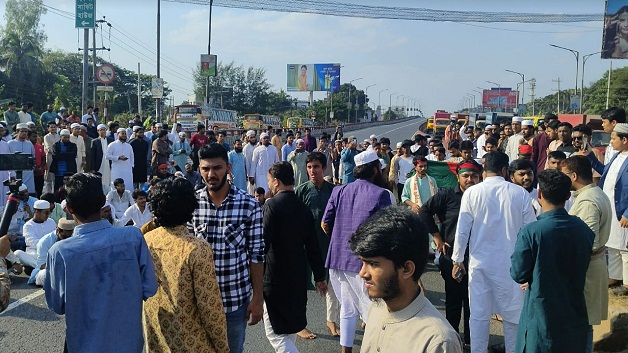 সরেজমিনে দেখা যায়, ওসমান হাদির হত্যাকারীদের বিচারের দাবিতে আন্দোলনকারীরা জুমার নামাজের পর শহরের জহিরিয়া মসজিদ থেকে একটি মিছিল নিয়ে শহীদ শহিদুল্লা সড়ক প্রদক্ষিণ করে মহাসড়কে এসে অবরোধ করে বিক্ষোভ শুরু করেন।