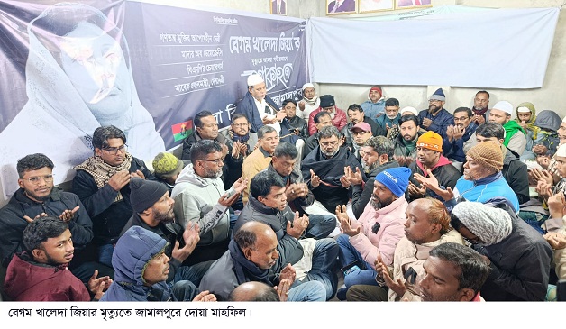 এখন বেগম খালেদা জিয়ার আদর্শকে ধারণ করে তার স্বপ্ন পূরণে আমাদের কাজ করে যেতে হবে। এ সময় জেলা বিএনপির সিনিয়র সহ সভাপতি লোকমান আহমেদ খান লোটন, সহ সভাপতি লিয়াকত আলী, যুগ্ম সাধারণ সম্পাদক খন্দকার মোস্তাফিজুর রহমান আরমান, সাংগঠনিক সম্পাদক সফিকুল ইসলাম খান সজিব, জামালপুর সদর উপজেলা বিএনপির সাধারণ সম্পাদক রুহুল আমিন মিলনসহ অন্যান্য অঙ্গ ও সহযোগী সংগঠনের নেতৃবৃন্দ উপস্থিত ছিলেন। পরে বেগম খালেদা জিয়ার আত্মার মাগফেরাত কামনা করে বিশেষ দোয়া করা হয়। দোয়া পরিচালনা করে হাফেজ খোরশেদ আলম।