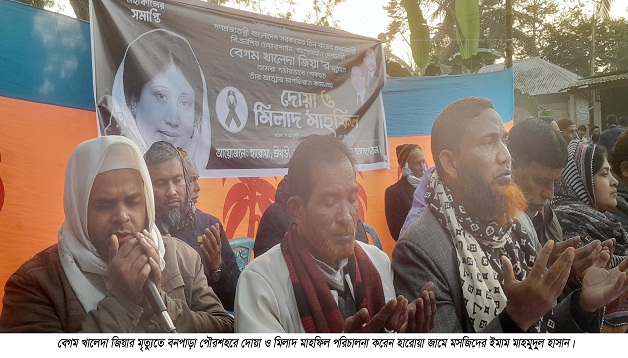 বড়াইগ্রাম (নাটোর) প্রতিনিধি: দেশনেত্রী সাবেক প্রধান মন্ত্রী বেগম খালেদা জিয়ার মৃত্যুতে বুধবার বিকেলে বড়াইগ্রামের বনপাড়া পৌর শহরের ৭ নং ওয়ার্ড বিএনপি’র উদ্যোগে হারোয়া রহিমের বটতলা মোড় এলাকায় দোয়া ও মিলাদ মাহফিল অনুষ্ঠিত হয়।