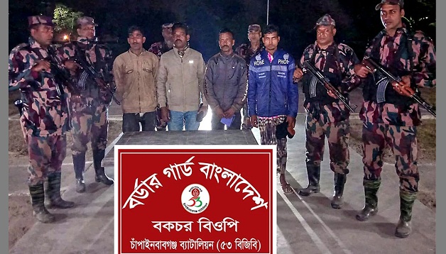 বিজিবি সূত্রে জানা গেছে, বুধবার সন্ধ্যা ৭টার দিকে গোপন সংবাদের ভিত্তিতে বকচর বিওপির দায়িত্বপূর্ণ সীমান্ত এলাকায় অভিযান পরিচালনা করে বিজিবির একটি টহল দল। তারপর শূন্যরেখা থেকে প্রায় ২০০ গজ বাংলাদেশের অভ্যন্তরে চাঁপাইনবাবগঞ্জ সদর উপজেলার চরআলাতলী ইউনিয়নের বকচর গ্রাম থেকে মানব পাচারকারী মো. শাহিনসহ ৪ জনকে আটক করা হয়।