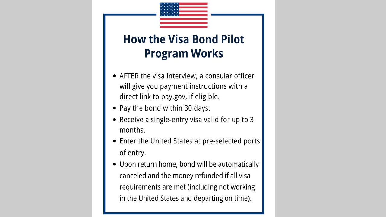 ‘ভিসা বন্ড’ পাইলট প্রোগ্রাম কীভাবে কাজ করে এ সংক্রান্ত বার্তায় আজ ঢাকার মার্কিন দূতাবাস জানিয়েছে বেশ কিছু তথ্য দিয়েছে। তথ্যগুলো হলো—