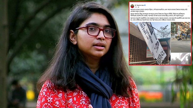 মঙ্গলবার (৩ ফেব্রুয়ারি) সকালে ফেসবুকে দেওয়া এক পোস্টে তিনি বলেন, ‘আমাদের ব্যানার যেখানে যেখানে ছিল, সেই জায়গাগুলোতে এখন কাদের ব্যানার টাঙানো আছে, তা এলাকার মানুষ দেখছেন।’ নির্বাচন কমিশনের বিধিনিষেধ মেনেই আবার সাদাকালো কাপড়ের ব্যানার টাঙানোর উদ্যোগ নেওয়া হচ্ছে জানিয়ে তাসনিম জারা বলেন, ‘আমরা আবারও কিছু সাদাকালো কাপড়ের ব্যানার টাঙানোর উদ্যোগ নিচ্ছি। নির্বাচন কমিশনের বিধিনিষেধ মেনেই সেটা করছি। আপনারা বিপক্ষ দলের ব্যানার ছিঁড়ে ফেলার এই সংস্কৃতি ছাড়ুন।’