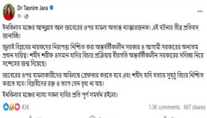 তাসনিম জারা তার স্ট্যাটাসে লেখেন, ইনকিলাব মঞ্চের আব্দুল্লাহ আল জাবেরের ওপর হামলা অত্যন্ত ন্যক্কারজনক। এই ঘটনার তীব্র প্রতিবাদ জানাচ্ছি। জুলাই বিপ্লবের নায়কদের নিরাপত্তা নিশ্চিত করা অন্তর্বর্তী সরকার ও আগামী সরকারের অন্যতম প্রধান দায়িত্ব। শহীদ শরীফ ওসমান হাদির বিচার প্রক্রিয়ায় ধীরগতি অন্তর্বর্তী সরকারের সদিচ্ছা নিয়ে সন্দেহের জন্ম দিয়েছে।