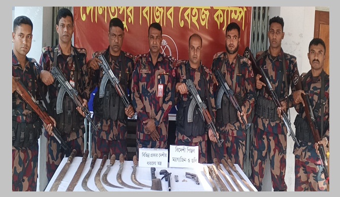 প্রেস বিজ্ঞপ্তিতে তিনি আরও জানান, অভিযানে মালিকবিহীন অবস্থায় ১টি বিদেশি পিস্তল, ১টি ম্যাগাজিন, ৩ রাউন্ড গুলি, ১টি দেশীয় শুটার গান এবং ২টি বড় রাম দা, ৫টি ছোট রাম দা, ৫টি হাসুয়া, ১টি চাপাতি ও ১টি ছুরিসহ মোট ১৪টি দেশীয় ধারালো অস্ত্র উদ্ধার করা হয়েছে। অভিযান চলাকালে বিজিবির ড্রোন ক্যামেরার আর্টিফিশিয়াল ইন্টেলিজেন্স (এআই) প্রযুক্তি ব্যবহার করে ঘটনাস্থল সুনির্দিষ্টভাবে শনাক্ত করা হয়। তবে এ ঘটনায় কাউকে আটক করতে পারেনি বিজিবি। উদ্ধারকৃত অস্ত্র দৌলতপুর থানায় মামলা দায়ের পূর্বক হস্তান্তরের কার্যক্রম প্রক্রিয়াধীন রয়েছে।