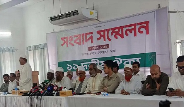 জরুরি বৈঠক শেষে মঙ্গলবার (৭ এপ্রিল) দুপুর সাড়ে ১২টায় মগবাজার আল-ফালাহ মিলনায়তনে ১১ দলীয় ঐক্য আয়োজিত সংবাদ সম্মেলনে একর্মসূচি ঘোষণা করেন বাংলাদেশ খেলাফত মজলিশের আমির মাওলানা মামুনুল হক।