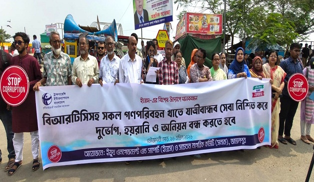 জামালপুরে গণপরিবহনে হয়রানি ও অনিয়ম বন্ধ করে যাত্রীবান্ধব সেবার দাবীতে মানববন্ধন